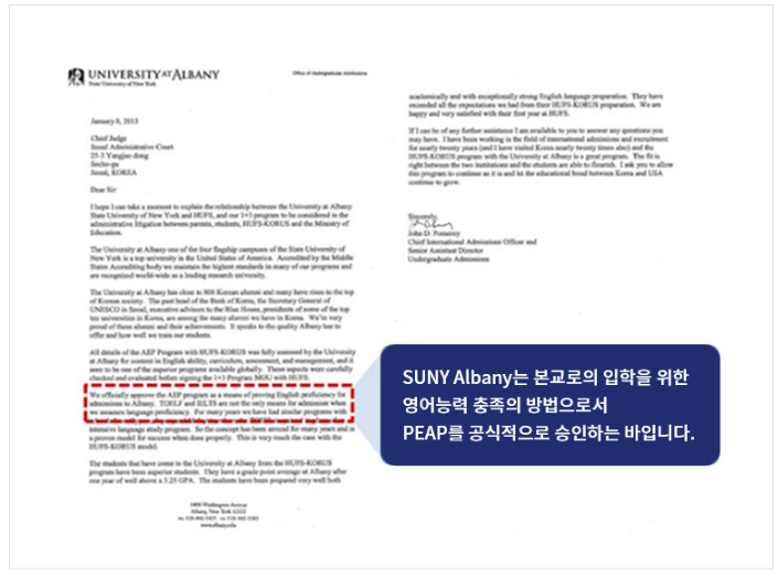 - PEAP 어학과정은 국내에서 개발된 어학과정 중 유일하게 미국대학들로부터 미국대학 입학에 필요한 영어능력(English Proficiency Requirement)을 충족시켜주는 영어교육 프로그램으로 공식 인증 받은 과정임