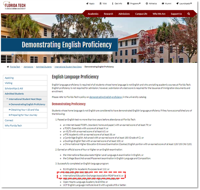 - PEAP 어학과정에 대해서 IEEA글로벌캠퍼스의 협력 미국대학들은 학교의 자체적인 평가심사를 통해 또는 제3의 평가기관(ECE, SpanTran 등)의 평가를 통해 학점을 인정해주고 있음 (학점 인정의 내용 및 범위는 미국대학의 고유한 권한으로 학교마다 상이함)