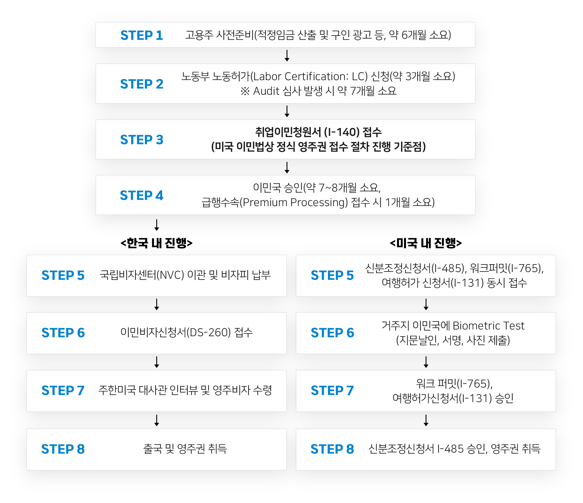 - 학사학위 이상 또는 특정 분야 2년 이상의 경력이 있고 미국 회사로부터 고용 제안(Job Offer)을 받은 경우 3순위 숙련으로 취업영주권 취득 가능(연간 30,000명 신청자 모집)