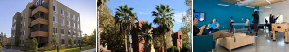 CSUN에는 3가지 타입의 기숙사가 있으며, 각 기숙사는 The Suites at University Park(1학년 학생), The Apartments at University Park(신입생 및 재학생) 그리고 The Apartments at University Village (가족이 있는 학생)으로 구성되어 있음. 기숙사에는 카드키 엑세스, 무선 인터넷 서비스, 레크리에이션 시설, 대학 내 관리서비스 등이 제공되며, 기숙사에서 캠퍼스 내 빌딩으로의 접근성이 매우 우수함. 기숙사의 학생들은 학기별 또는 매달 Meal Plan을 구입하여 교내 식당을 이용할 수 있음. 또한 학생들은 기숙사 학생들을 위한 커뮤니티 활동에 참여할 수 있으며, 기숙사 내의 다양한 공동시설을 함께 사용할 수 있음.
